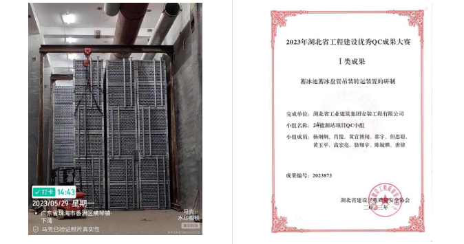 依托公司”青創”工作室的平臺,項目部組織成立QC小組,將蓄冰盤管吊裝轉運過程作為研方向,研究成果——蓄冰池蓄冰盤管吊裝轉運裝置的研制榮獲“2023年湖北省工程建設優秀QC成果大賽Ⅰ類成果”,這是對項目部的努力付出最好的認可。